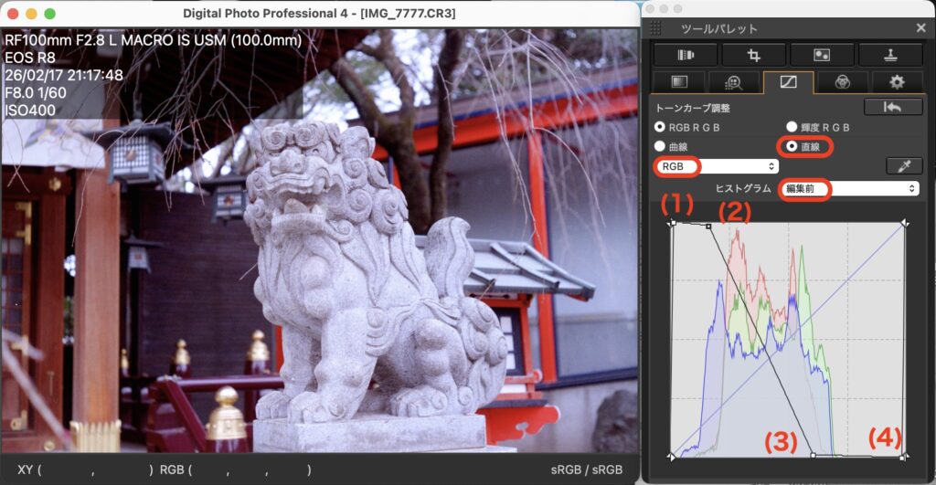- トーンカーブ調整から「直線」、表示ヒストグラムは「編集前」を選択。ドロップダウンメニューは「RGB」を選択。