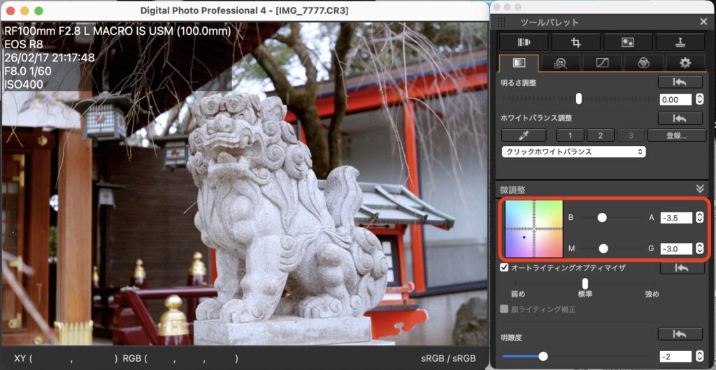 反転した画を見ながら、基本調整のタブにある赤枠の部分でホワイトバランスのずれを微調整できる。