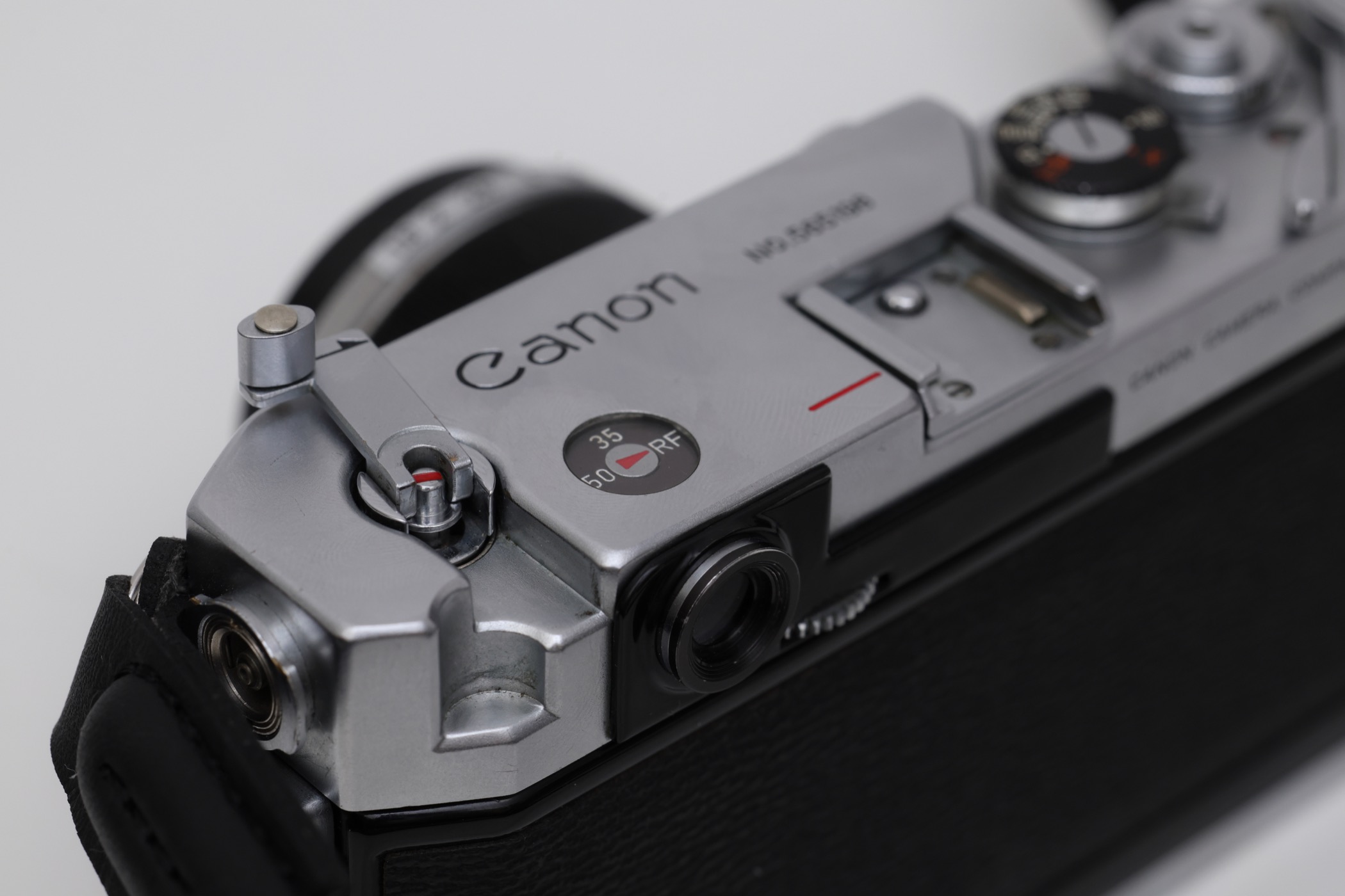 Canon Pなどとおそらく共通の巻き戻しクランク。勝手に跳ね上がっちゃったり、小さくてつまみづらかったりするが、見た目と収まり感が非常に良い。ファインダー内には二重像があるのみで、どの焦点距離でも見やすくはないが、使えなくはない。なんならCanonet (1961年発売)のファインダーの方が見やすい。ダイアルをRFにすれば高倍率のファインダーになるので、ピント合わせを精密にできる点は良い。